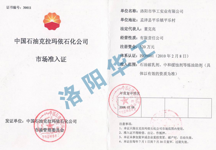 中國(guó)石油克拉瑪依石化公司市場(chǎng)準(zhǔn)入證